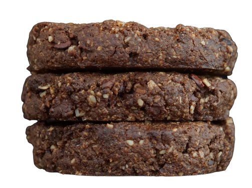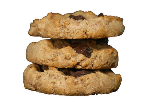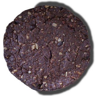 Ingredientes: harina de almendra, avena, cacao orgánico, nibs cacao, mantequilla de cacahuate artesanal, fecula de tapioca, azúcar de coco orgánico, aceite de coco orgánico, miel de agave orgánico, linaza, vainilla y un toque de sal.