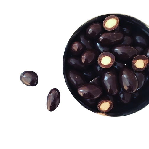 Almendras, chocolate (edulcorante: maltiol (42g/100g), manteca de cacao, cacao en polvo, pasta de cacao, y extracto natural de vainilla.