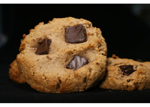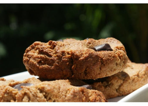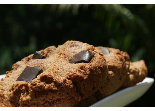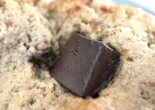 Harina de almendras, stevia, mantequilla de almendra casera, huevo orgánico, proteína de chocolate sin lactosa, chispas de chocolate endulzado con stevia, proteína hidrolizada de suero de leche sin lactosa, pizca de sal.